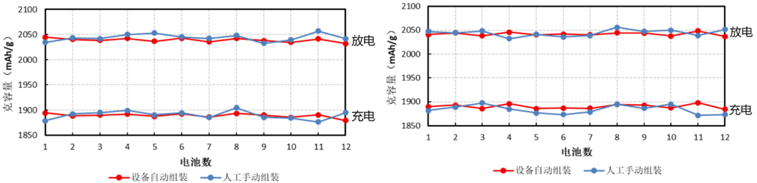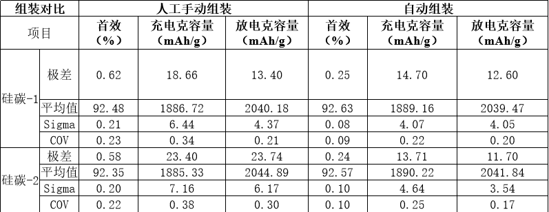 如表1所示,硅碳材料充放电克容量自动组装的极差值为11.70~14.70mAh/g,σ值约3.54~4.64,COV值约0.17~0.25%。人工组装的极差值为13.40~23.74mAh/g,σ值约4.37~7.16,COV值约0.21~0.38%。从图3可以看出,自动组装与人工组装的扣电克容量平均值接近,但结合表1的统计数据,自动组装的数据稳定性优于人工组装。评估了硅碳半电池的电化学性能,解决了人工组装中因操作差异导致的性能评估偏差,为新材料研发提供了高效、可靠的解决方案。