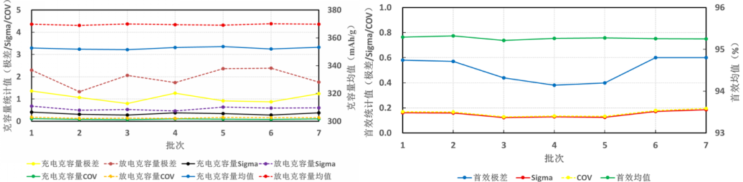 如图5左图所示,每组充/放电克容量的sigma值均小于0.39;每组充/放电克容量的极差值均小于1.3mAh/g;每组充/放电克容量的COV值均小于0.2%。如图5右图所示,每组首效的极差值均小于0.58%;每组首效的sigma值均小于0.24;每组首效的COV值均小于0.27%,这表明自动组装的三元半电池的首效稳定性和充放电一致性较好。