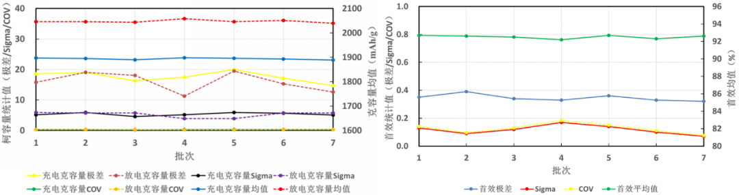 图6. 组装石墨半电池的充放电克容量&首效统计值波动图