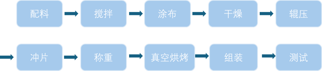 扣式电池的制备流程是电极材料从原材料粉体到成品电池的过程,其工艺精度与标准化水平决定了材料电化学性能评估的准确性。如图1所示,该制备过程需经过材料配比、搅拌,浆料涂布,极片干燥、辊压、冲片、称重、真空烘烤,再到电池组装和测试。